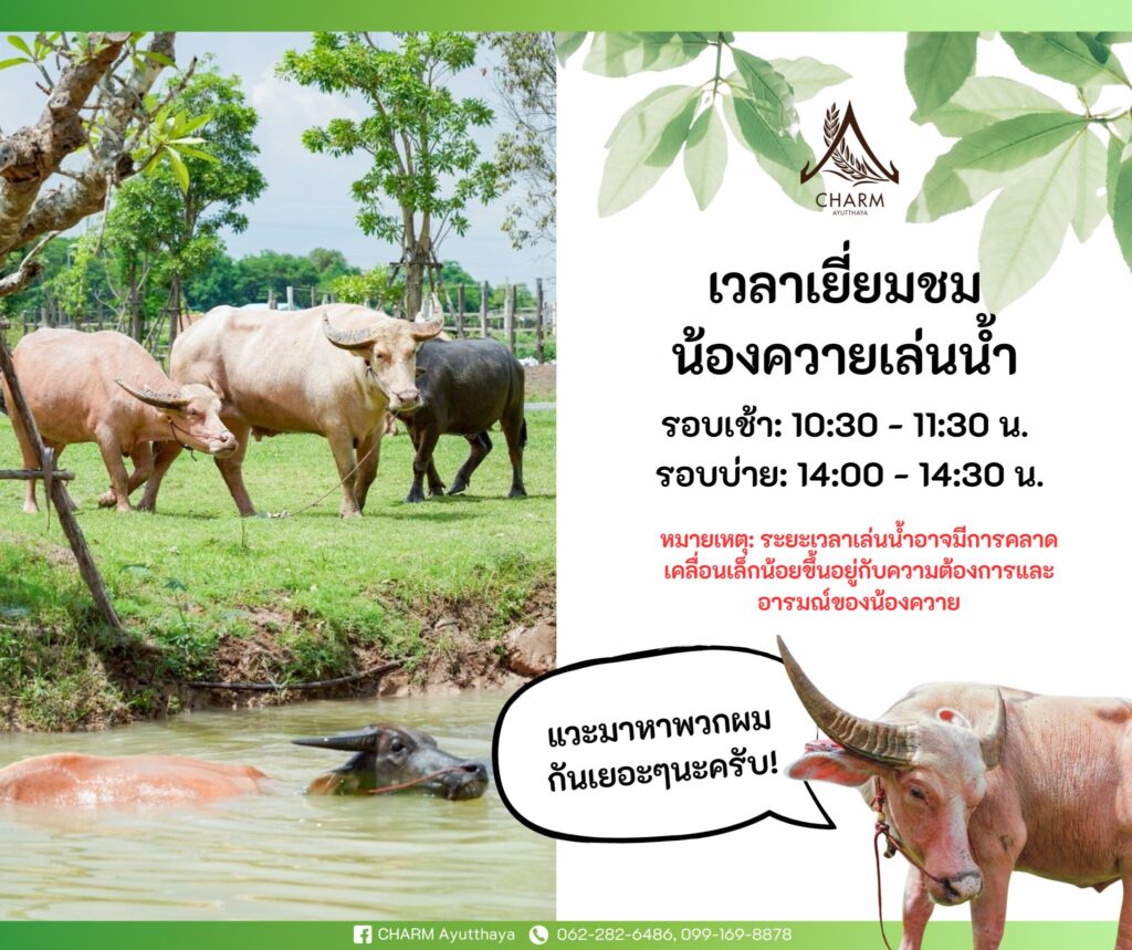 ขอเชิญคุณมาสัมผัสประสบการณ์สุดพิเศษที่ CHARM Ayutthaya รีสอร์ท & คาเฟ่สไตล์ไทยอยุธยา ที่นอกบรรยากาศสวยๆ แล้วเรายังมีน้องควายน่ารักๆ ที่พร้อมมาเล่นน้ำสร้างสีสันให้คุณได้ใกล้ชิดธรรมชาติและวิถีไทยแท้